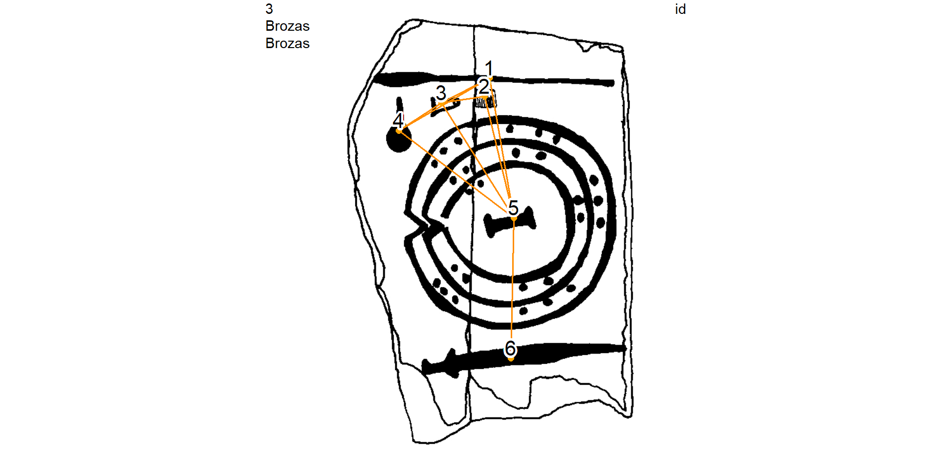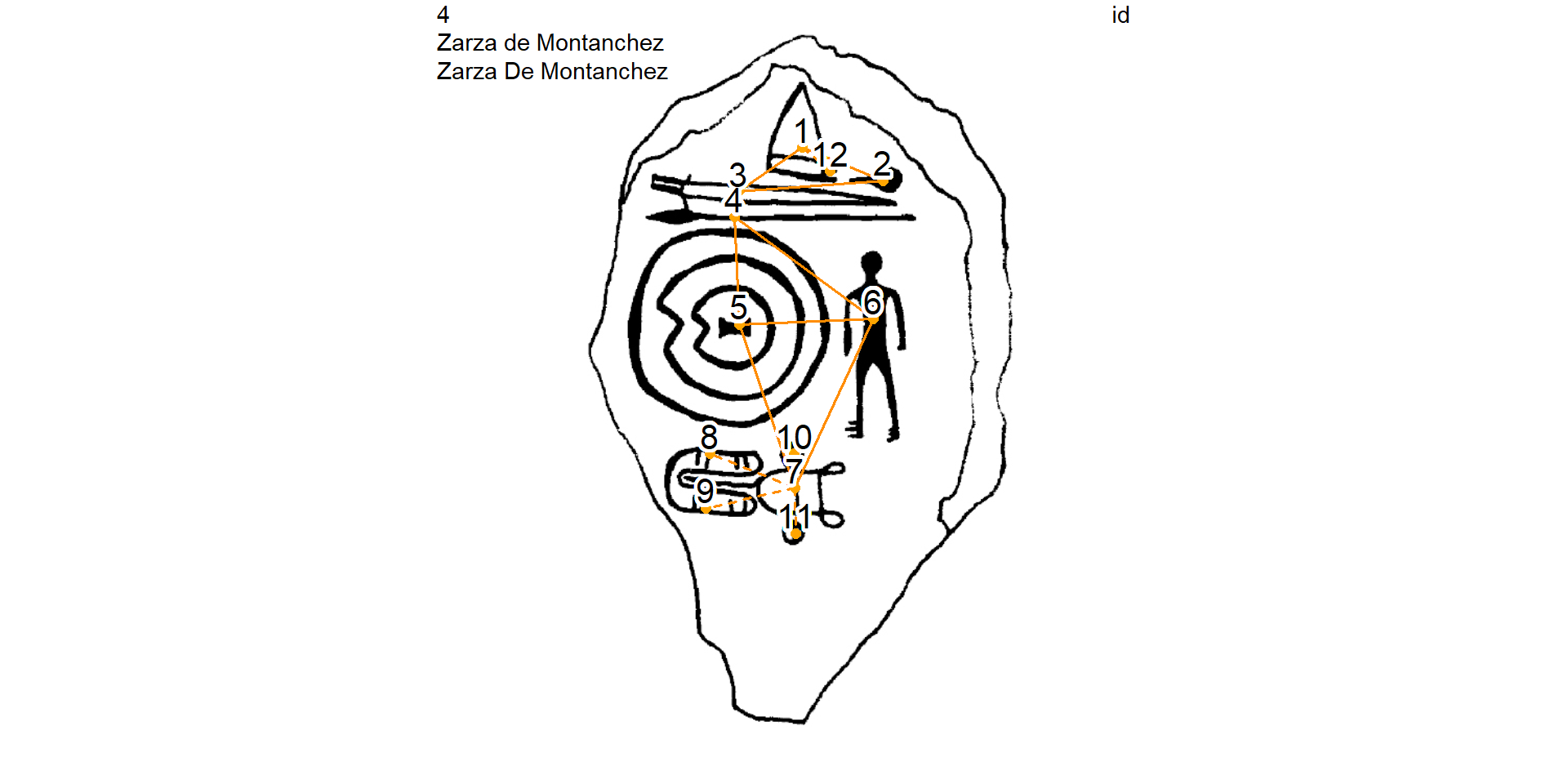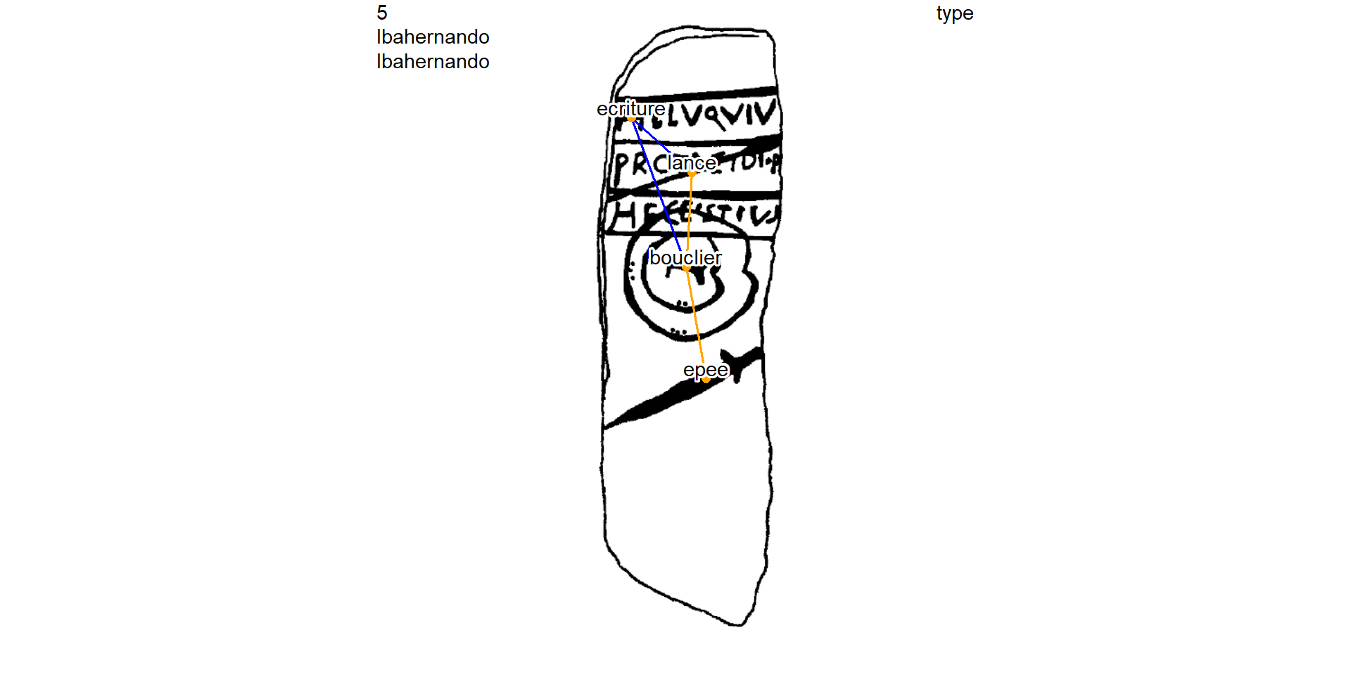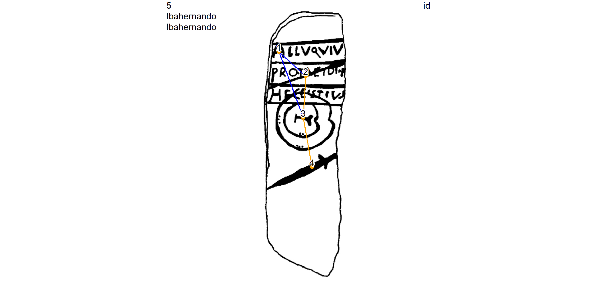 Plot the Ibahernando stelae and remove the Latin writing GU (ecriture, id = 1) from the studied graph by selecting GUs contemporaneous to the sword (id = 4)