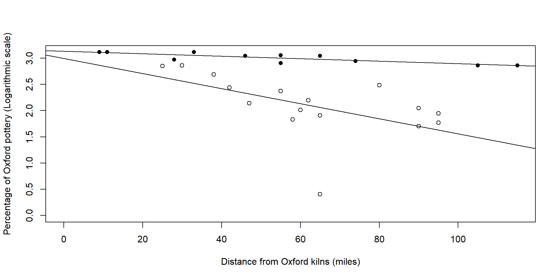 ylab = "Percentage of Oxford pottery (Logarithmic scale)")